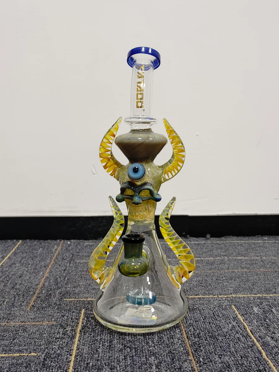 The TATAOO 11.5" Cool Ornate Satanic Beaker Glass Dab Rig blends dark aesthetics with intricate craftsmanship, creating a bold and visually striking piece. The body features elaborate satanic-inspired ornamental details, adding depth, texture, and a mysterious, rebellious edge that instantly stands out.